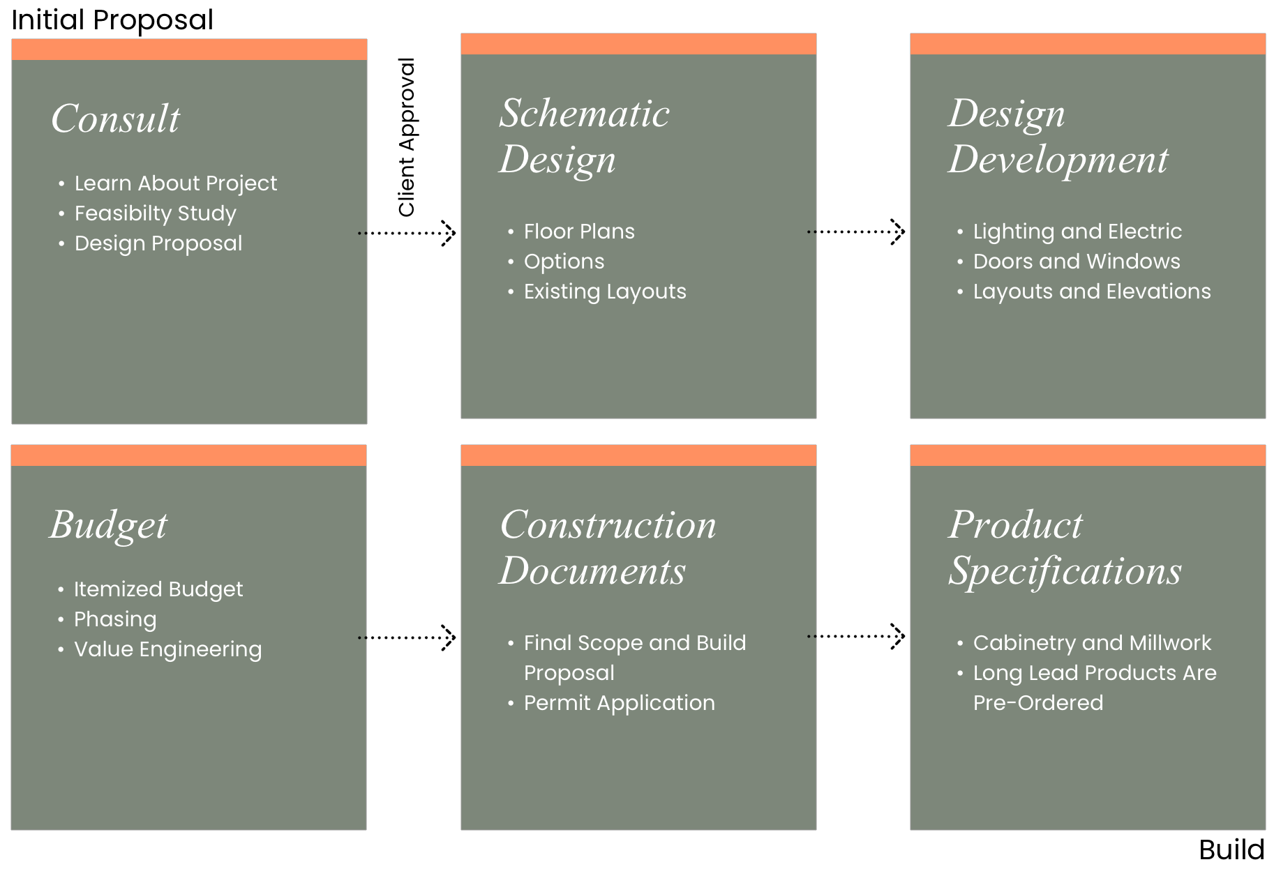 Our “open collaboration” design and project methodology is central to our success and to client satisfaction. By maintaining 360 degree visibility to the complex needs of owner, architect, and builder, we can stay true to the client’s vision while managing to schedule and budget constraints. The result: a crafted environment that meets project goals and reflects our client’s unique personality.
